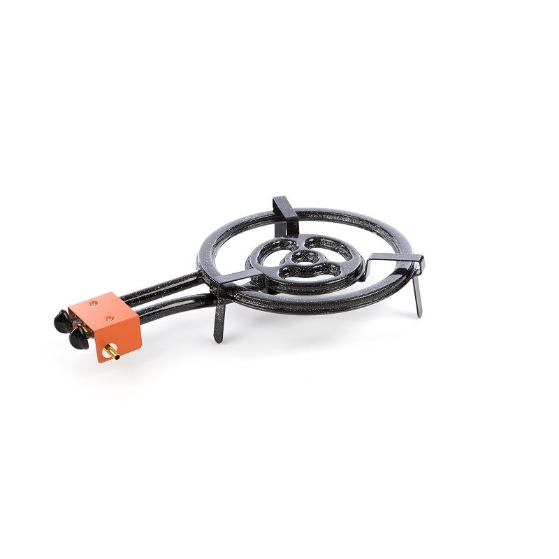 Este paellero de gama alta permite cocinar paelleras de entre 4 a 22 raciones. Al igual que el resto de paelleros de su categoría, dispone de salida de llama lateral y de una distribución de fuegos que asegura un reparto óptimo de la temperatura.